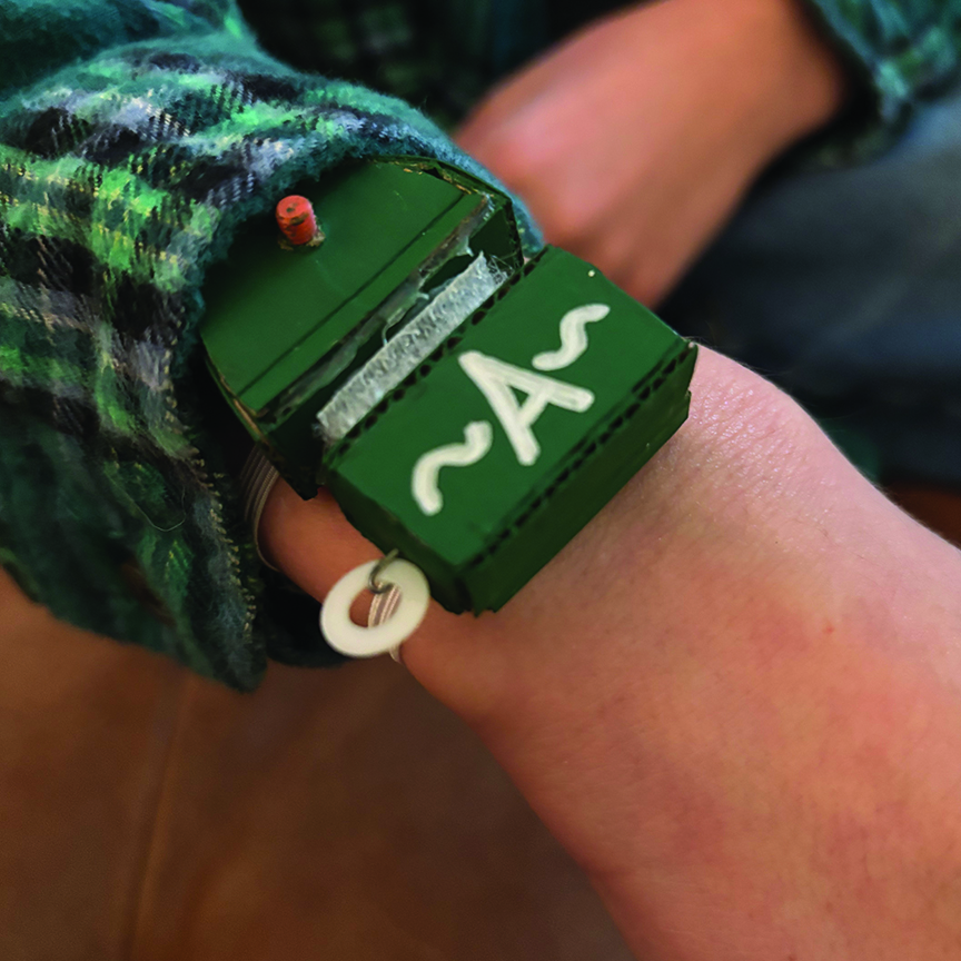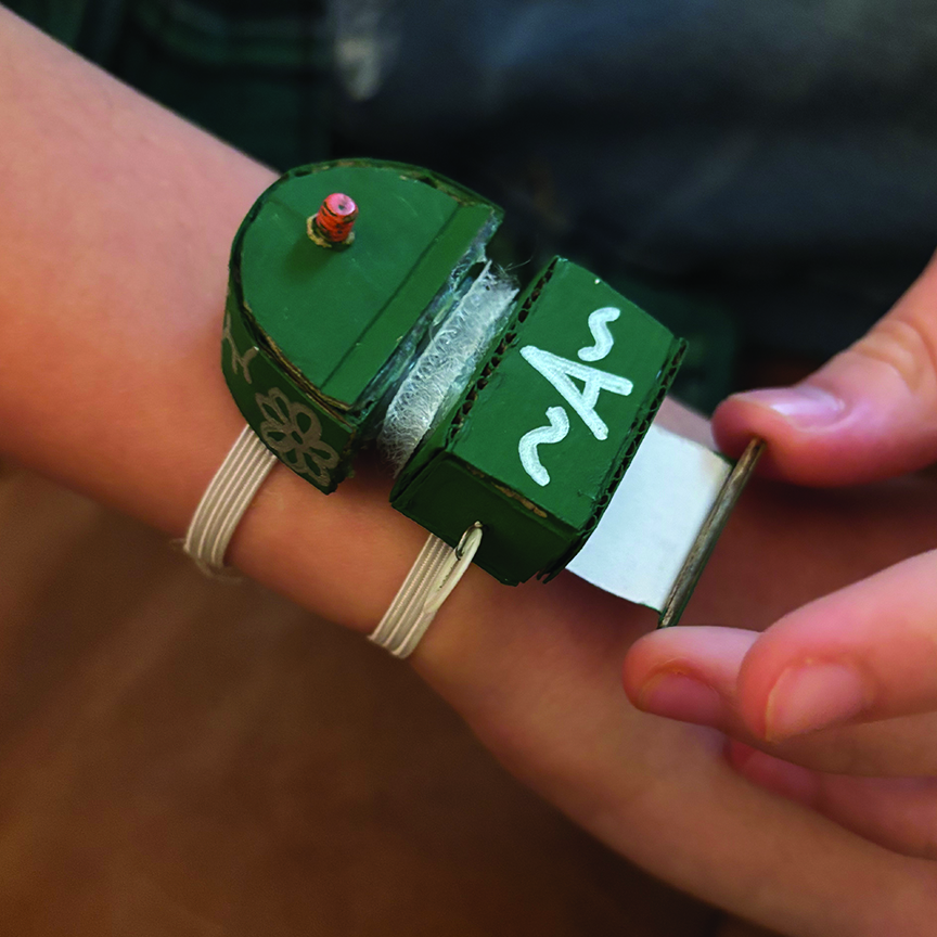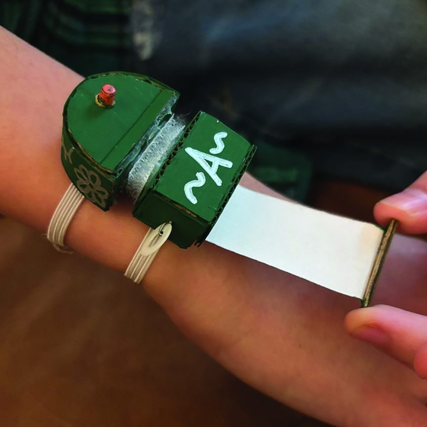 For middle school when I change classes, I made a wristband to hold my schedule. This was to prevent me from loosing my schedule while I learned it. I used paper clips, paint, elastic, hot glue, paper, Velcro, a nut, and screw